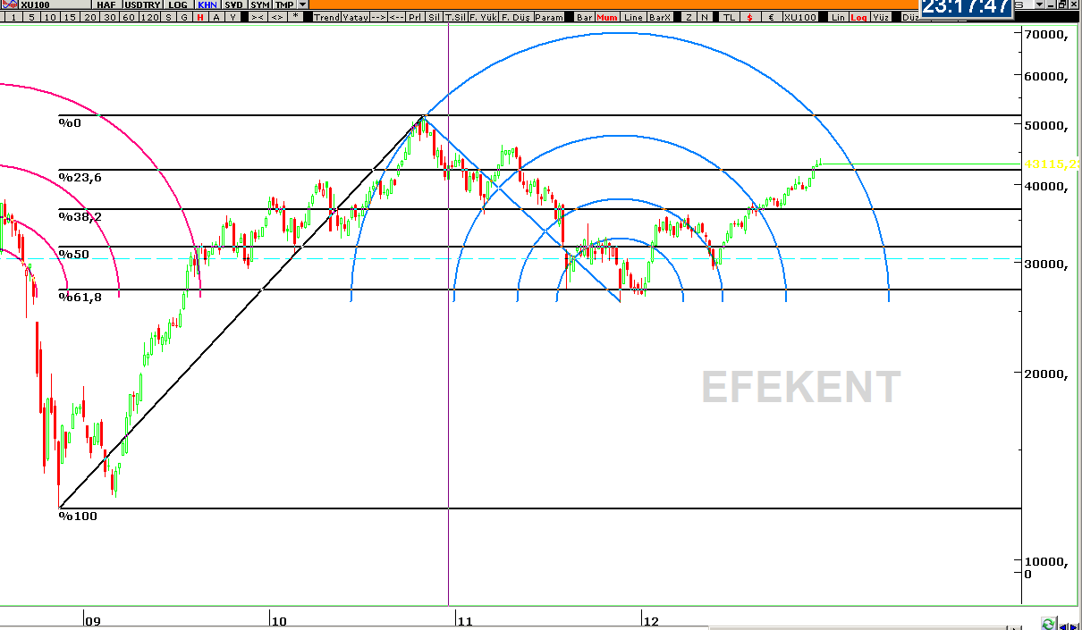 XU100 HAFTALIK DOLAR BAZLI LOGARİTMİK FIBO YAY GÖRÜNÜM