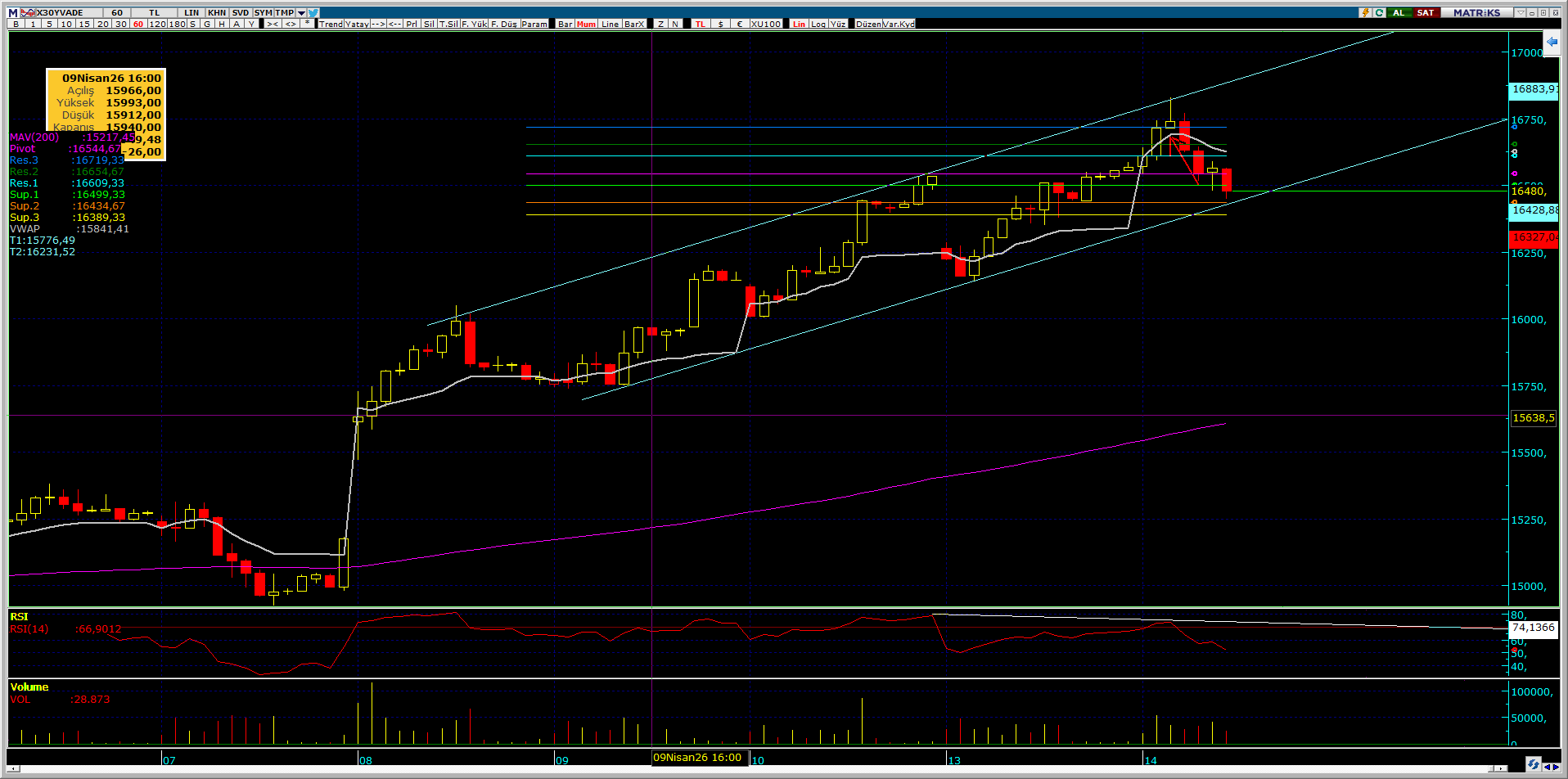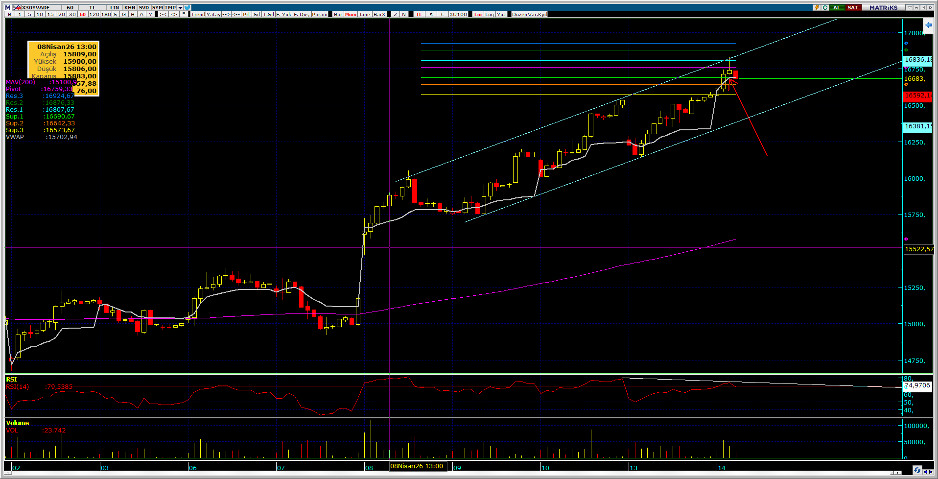 işaretlediğim hacim ağırlıklı ortalamanın altında saatlik kapanış alsak kanal alt bandına kadar bile süzülebilir.