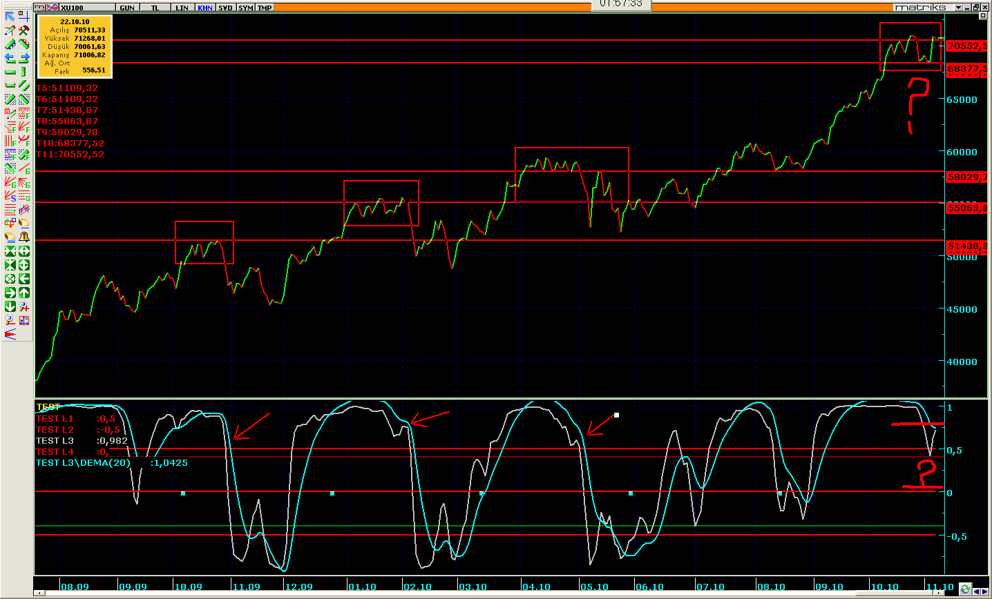 ENDEKS 4 İŞARETLİ BÖLGE BENZERLİĞİ TAŞIMASI BANA YÜKSELİŞİN ŞAİBELİ OLMASINI FAZLASIYLA DÜŞÜNDÜRÜYOR.İŞARETLİ BÖLGE ÜZERİNDE EN AZ İKİ YUKARDAN KAPANIŞ YAPMASI GREKTİĞİ ŞARTIM OLUŞMAZSA,DÜŞÜŞ KAÇINILMAZ GİBİDE DURUYOR.TEST OSİLATÖRÜDE GÜNLÜKTE ZİRVE YAPAMAMIŞ OLMASI ŞAİBEYİ BİR KAT DAHA ARTTIRIYOR.UMARIM YANILMIŞIMDIR.