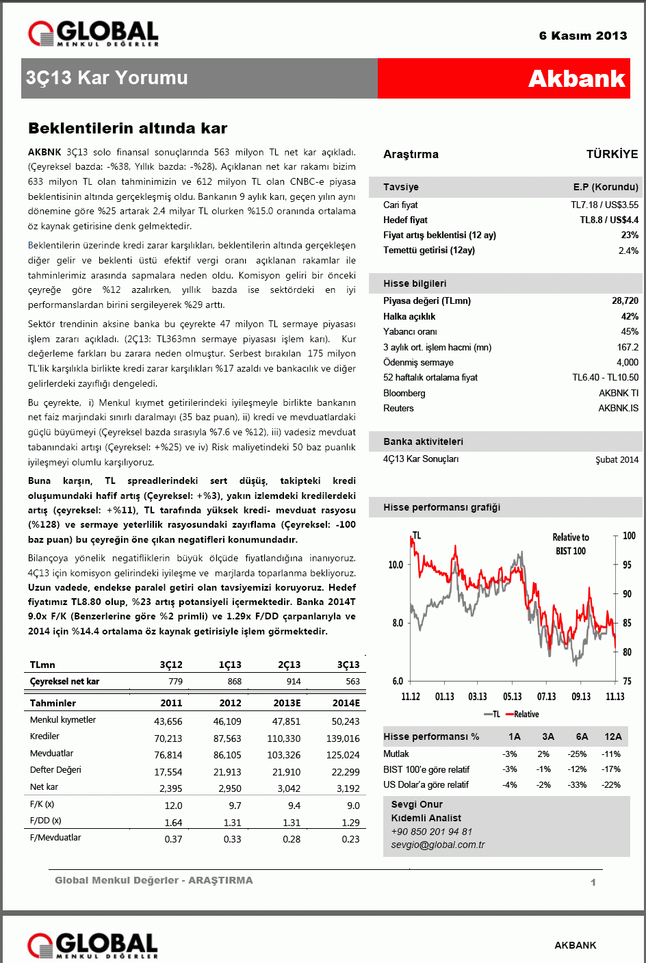BNP Paribas, Akbank için fiyat hedefini 8.14 TL'den 7.80 TL'ye indirdi, tavsiyesini TUT olarak korudu.