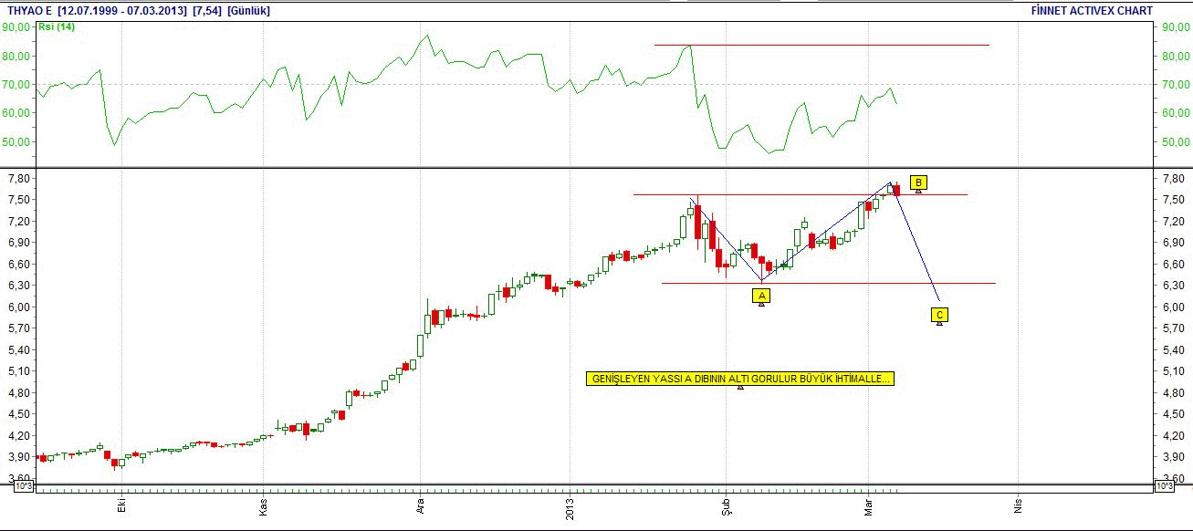 THYAO;ÇILGINLIK DALGASININ DUSELTMESINDEDIR VE DÜŞÜŞE TEPKI DALGASI Bİ ONCEKİ TEPEYI GEÇMİŞTİR,BELKİ BIRAZ DAHA İLERIYE KENDINI ATABILIRSEDE ,BANA GORE OLAY BITMİŞTİR TEPE GEÇİLMİŞ VE RSI GERIDE KALMIŞ NEGATIF UYUMSUZLUK İLE B TEPKI DALGASININ BITTİGİ ANLATILMAKTADIR.GENİŞLEYEN YASSI OLUSUYOR VE A dıbıde muhtemelen aşagıya dogru gecılır,5 dalga düşüşü takıp edılmeldır.